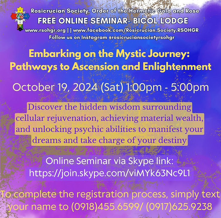 You are warmly invited to attend a FREE Online Seminar titled "Embarking on the Mystic Journey: Pathways to Ascension and Enlightenment" scheduled for October 19, 2024, Saturday, from 1:00 pm to 5:00 )m.